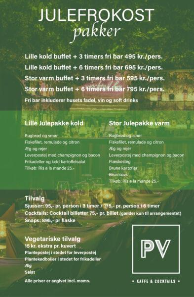 PV – Kaffe og Cocktails står klar til at hjælpe dig med at arrangere årets julefrokost! Vi afholder for både private og erhverv, og vi laver julefrokoster alle ugens dage. Vi har plads til alt fra 10 til 70 spisende gæster, så vi har formentlig også kapacitet til dit selskab.